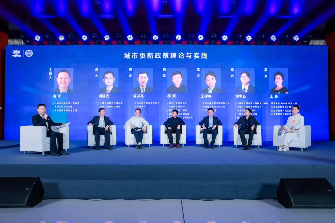 在主题沙龙环节,北京市委城市工作委员会办公室秘书处处长胡洪亮,北京市城市更新联盟秘书长、中国建设银行北京分行公司部总经理王学伟,中国建筑科学研究院副总工程师、中建研科技股份有限公司党委书记、董事长、一级注册结构工程师,博士生导师刘军进,清华大学建筑设计研究院总建筑师、教授级高级工程师、国家一级注册建筑师、APEC注册建筑师、2009-2010美国麻省理工学院(MIT)访问学者祁斌,愿景集团副总裁、总设计师江曼,中国铁建股份有限公司投资开发部副总经理刘建光共话有关城市更新政策、理论与实践等方面的关键问题,共同描绘发展蓝图。中铁第五勘察设计院集团有限公司院长助理、资本运营事业部总经理赵汉主持主题沙龙。